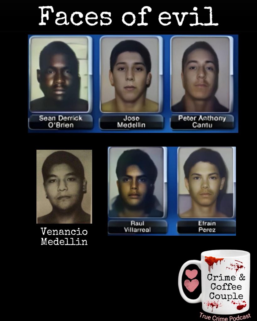 When the group of boys came back to Joe’s house, they were laughing & bragging about what they’d done to the girls & they also had their jewelry in their possession. Peter Cantu was the group’s leader of their self-proclaimed “Black & White Gang.” The other members included 18-year-old Jose Ernesto Medellin, Jose’s brother, 14-year-old Venancio Medallin, 17-year-old Efrain Perez, 18-year-old Derrick Sean O’Brien & 17-year-old Raul Omar Villarreal. The group of six were also with another pair of brothers, Roman & Frank Sandoval, but they took off when they began attacking the girls. They never reported what happened to authorities, but testified at the trials.