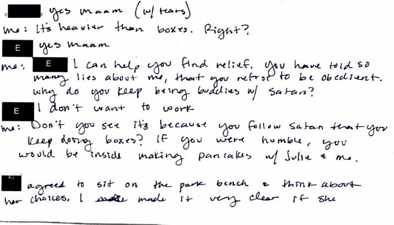 The children were repeatedly told that they were evil & possessed & were made to believe that the punishments & torture they endured were necessary to repent. One entry read, If you can engage a weak minded soul in a physical activity of obedience you can begin to break the bond Satan made with the weak. In another she wrote, These selfish children who only desire to take, lie & attack have zero understanding of God’s love for them. She also wrote about how her son refused to do any more work & began screaming. As a punishment, his hair was shaved off. The next day, the entry indicated that he attempted to run away.